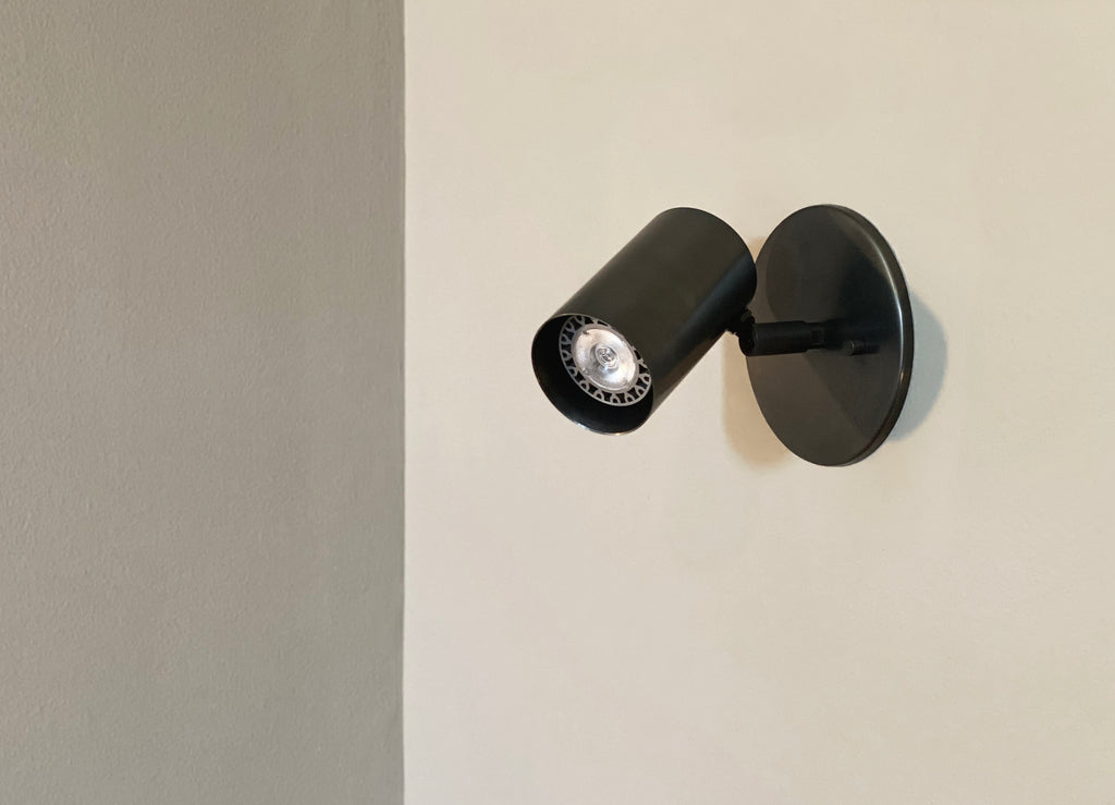 Designed and handmade to order in our Texas studio. Features heavy gauge solid brass construction. Shade head adjust to true vertical and horizontal positions and turns 330 degrees on axis. Excellent directional wall reading task light.