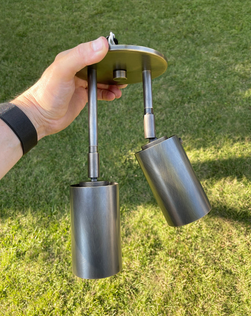 Designed and handmade to order in our Texas studio. Features heavy gauge solid brass construction. Each spot head adjust to true vertical and horizontal positions and turn 330 degrees on axis. Excellent alternative to track lighting and recessed can lights. This directional ceiling spot is ideal for accent, task or general lighting for flat or vaulted ceilings.