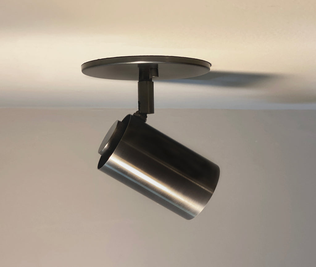 Designed and handmade to order in our Texas studio. Features heavy gauge solid brass construction. Shade head adjust to true vertical and horizontal positions and turns 330 degrees on axis. Excellent directional ceiling downlight for flat or vaulted ceilings, this fixture is a great alternative to recessed can lights and perfect for providing general or task lighting throughout any home or business.
