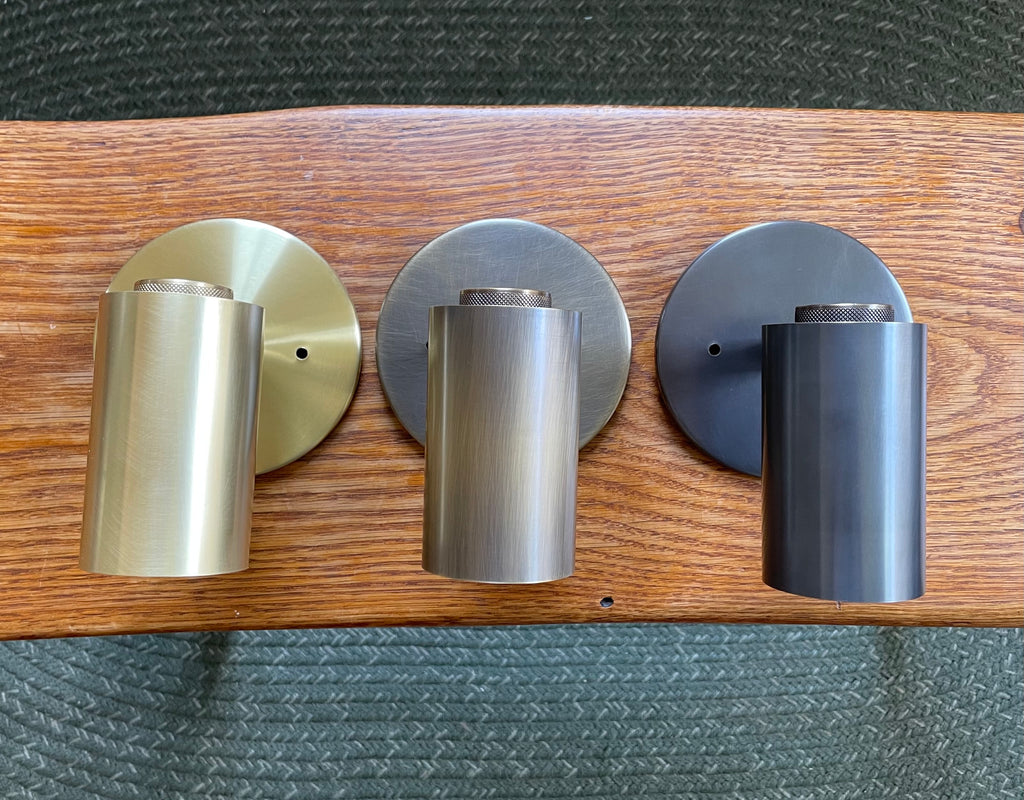 Available in natural brass, warm oxidized brass, and black oxidized brass. Finish samples available for purchase here. Made with live, unlacquered brass that is waxed for an even finish that will patina with time.