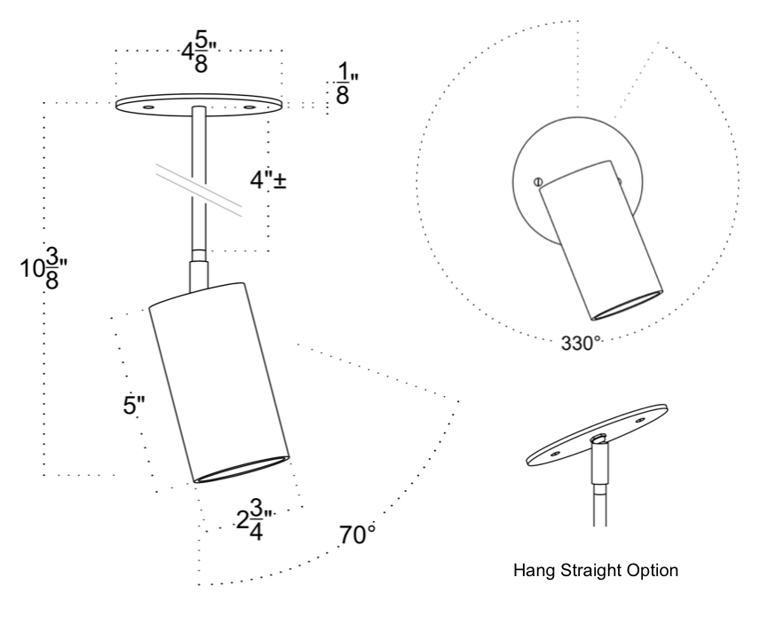 Hang Straight: Additional swivel at backplate end for use on vaulted ceilings. This option allows for the drop rod to hang vertically on a slanted ceiling. Adds 1 7/8” to tip-to-tip length.