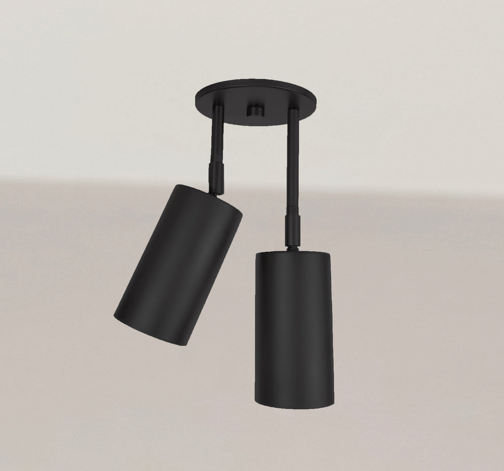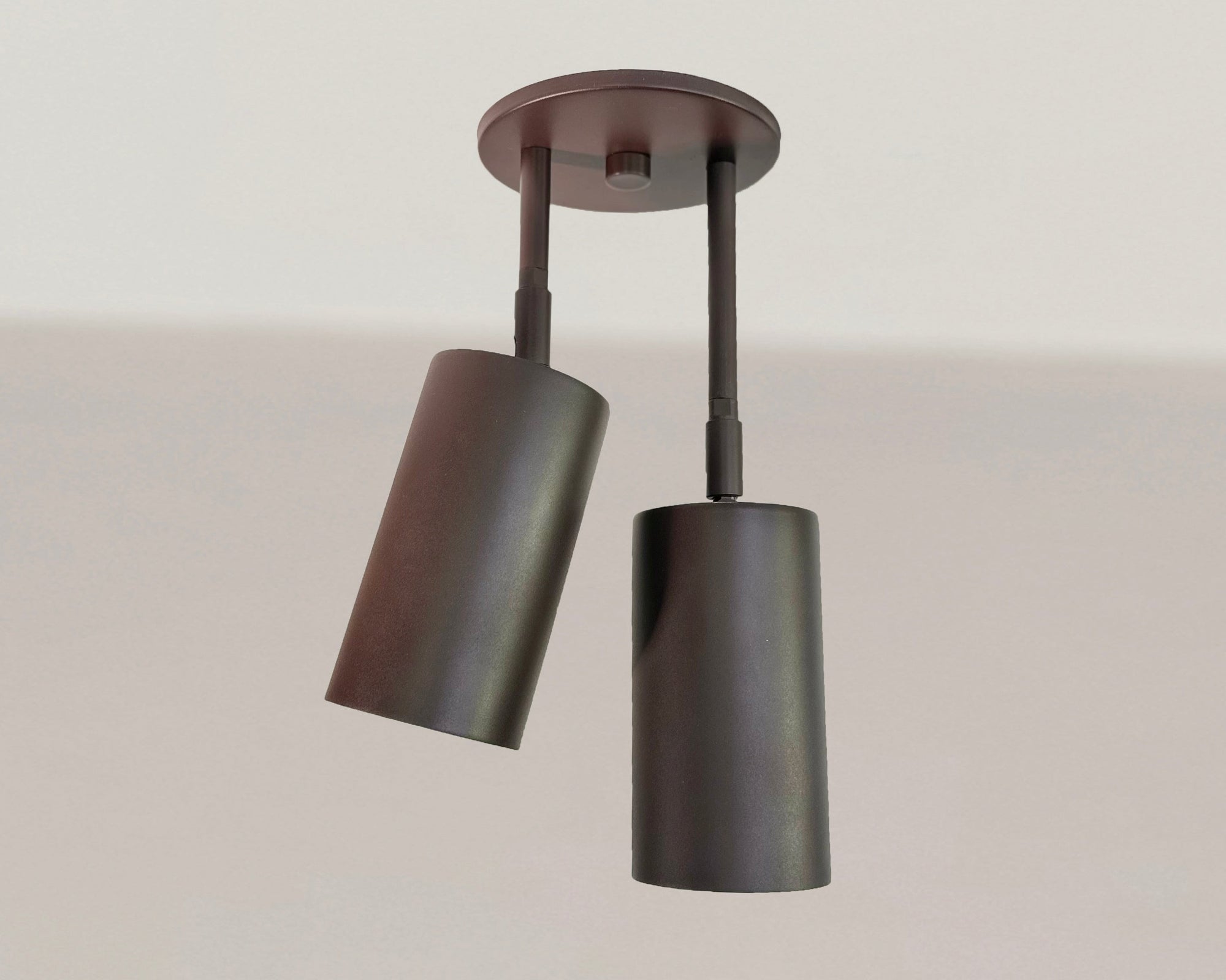 Designed and handmade to order in our Texas studio. Features heavy gauge solid steel construction. Shade heads adjust up and down and turn 330 degrees on axis. Excellent directional ceiling downlight for flat or vaulted ceilings.