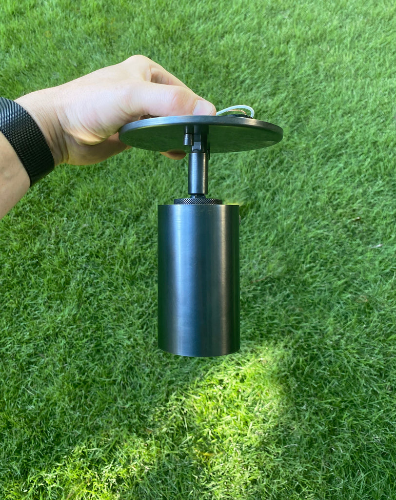 Designed and handmade to order in our Texas studio. Features heavy gauge solid brass construction. Shade head adjust to true vertical and horizontal positions and turns 330 degrees on axis. Excellent directional ceiling downlight for flat or vaulted ceilings, this fixture is a great alternative to recessed can lights and perfect for providing general or task lighting throughout any home or business.