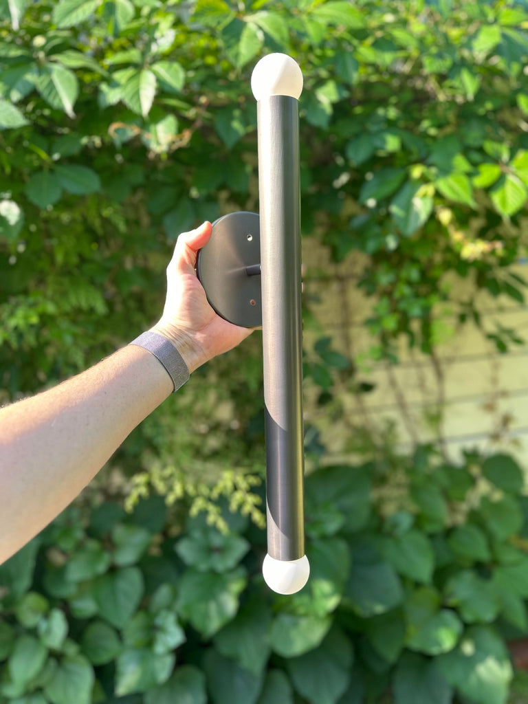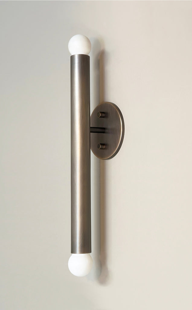 Designed and handmade to order in our Texas studio. This fixture boasts sleek, minimal inset brass connection points and solid brass construction from top to bottom. Its versatile design makes it an excellent choice as a vanity or wall sconce. Mounts vertically on wall.