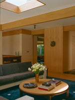Install photos - living room /w wood ceiling beam and skylight courtesy of OME Dezin.