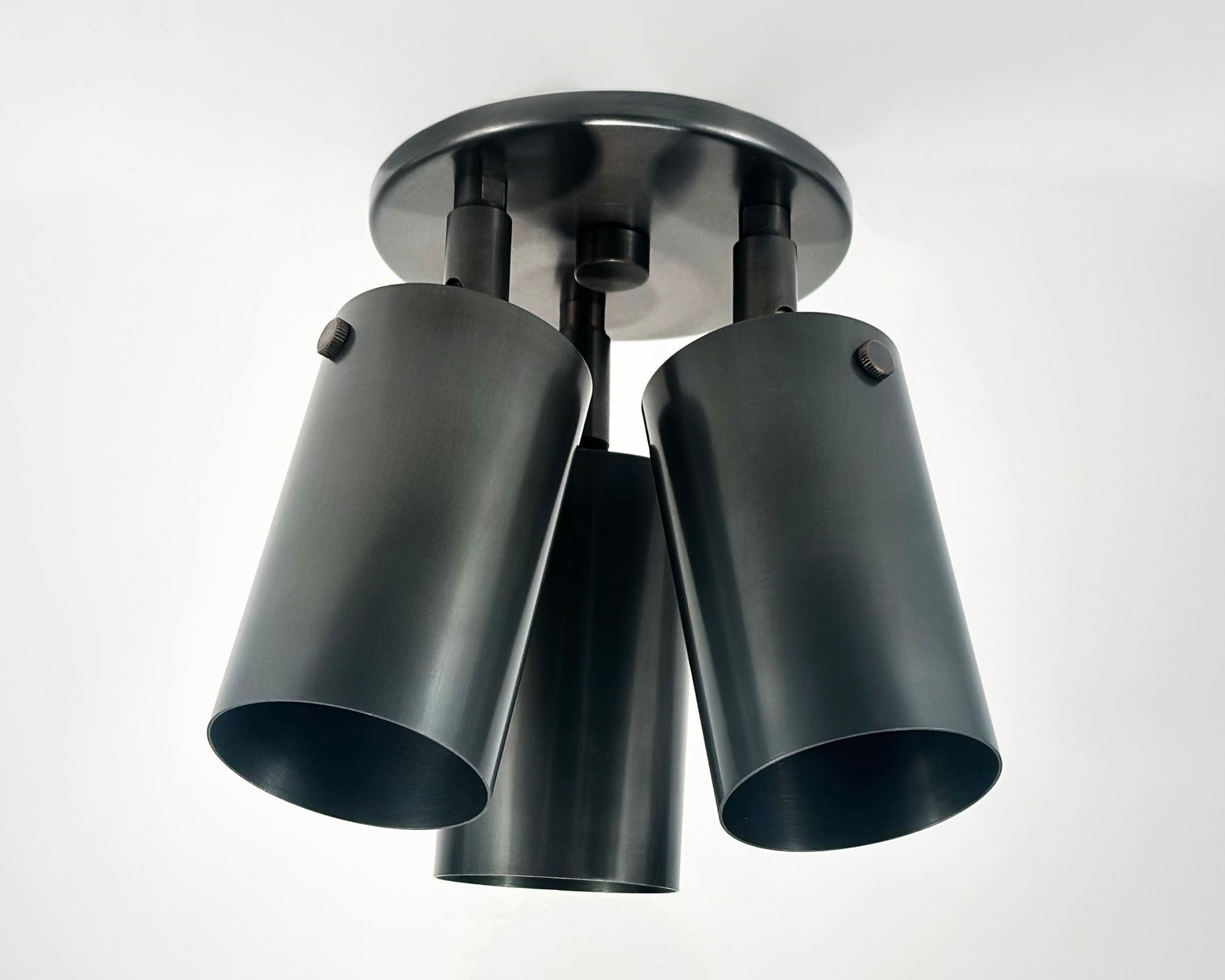 Designed and handmade to order in our Texas studio. Features heavy gauge solid brass construction. The double or triple spot heads adjust to true vertical and horizontal positions and turn 330 degrees on axis. Excellent directional ceiling downlight for flat or vaulted ceilings.