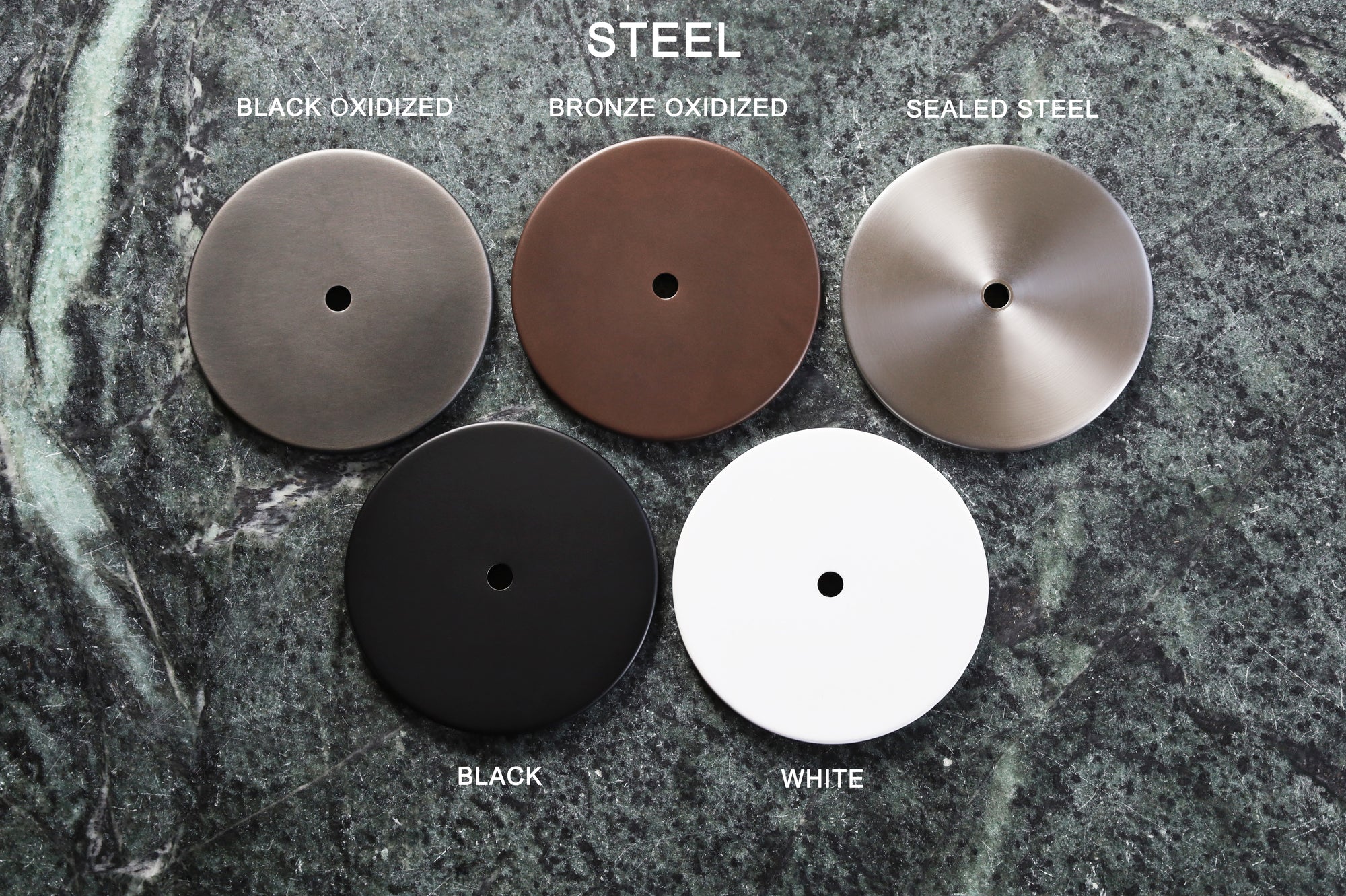 Finish names from primary image. Top row: Natural Brass, Light Oxidized Brass, Warm Oxidized Brass, and Black Oxidized Brass. Second row: Powder Coated White (matte), Powder Coated Black (matte), Sealed Steel, Black Oxidized Steel, and Bronze Oxidized Steel.