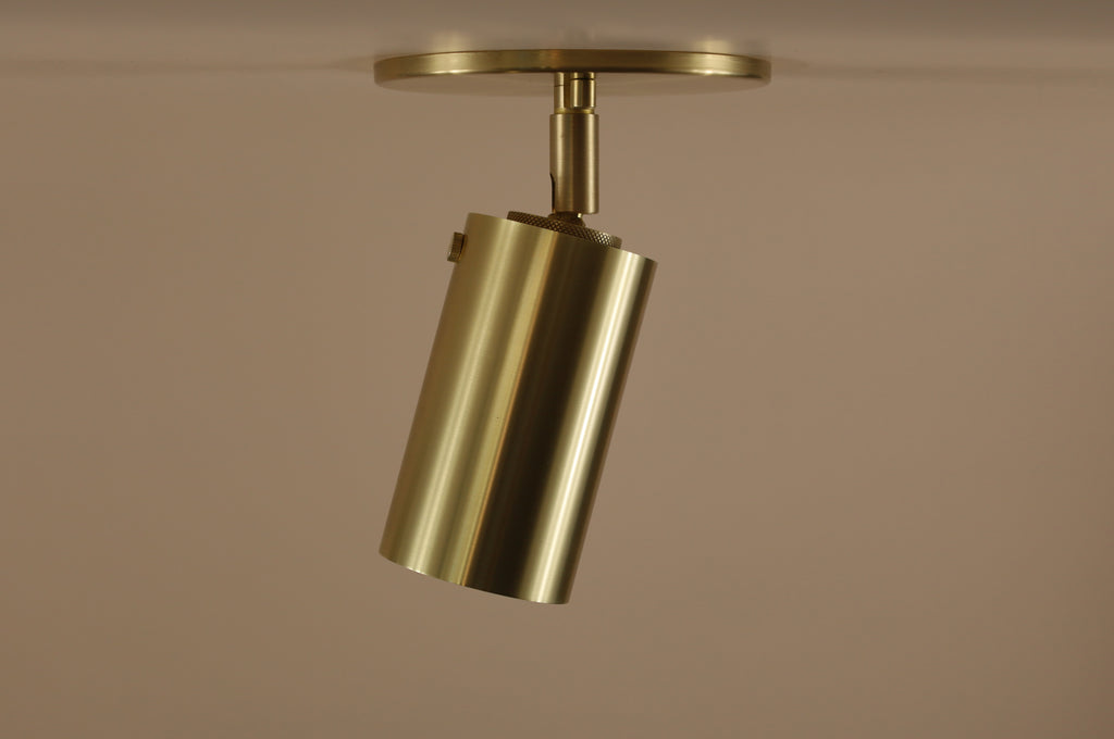 Designed and handmade to order in our Texas studio. Features heavy gauge solid brass construction. Shade head adjust to true vertical and horizontal positions and turns 330 degrees on axis. Excellent directional ceiling downlight for flat or vaulted ceilings, this fixture is a great alternative to recessed can lights and perfect for providing general or task lighting throughout any home or business.