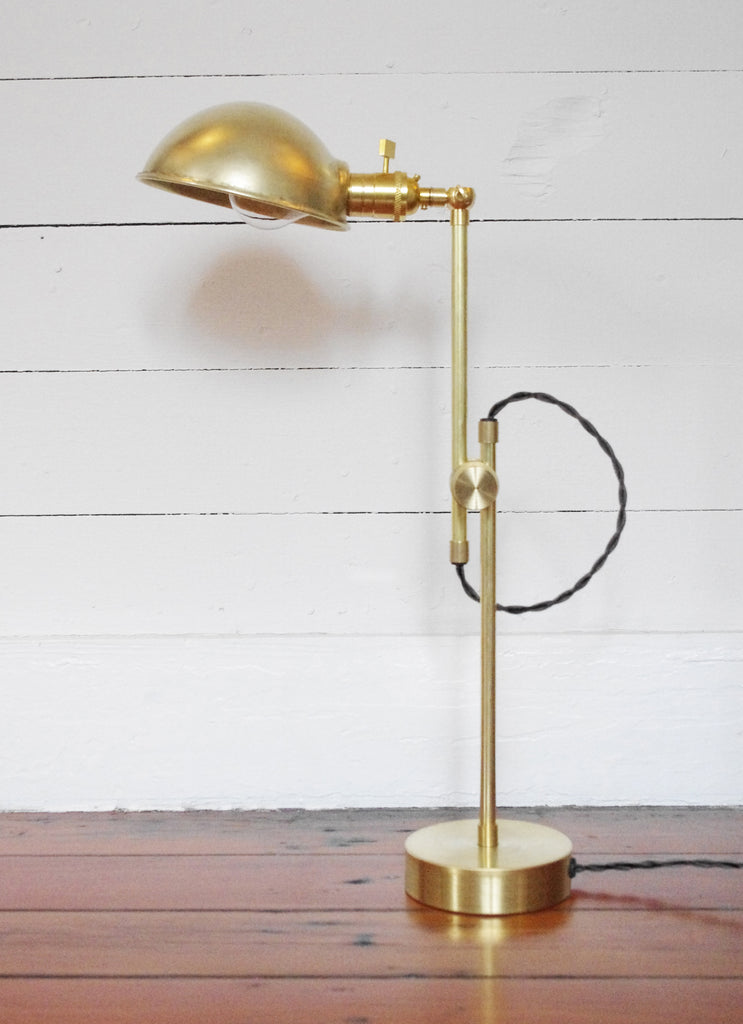 All Long Made Co. lighting is designed and handmade with care in our Texas studio. This table lamp's shade can angle up and down while the articulating arm can be positioned 360 degrees and locked down with a twist of the sturdy thumb knobs.