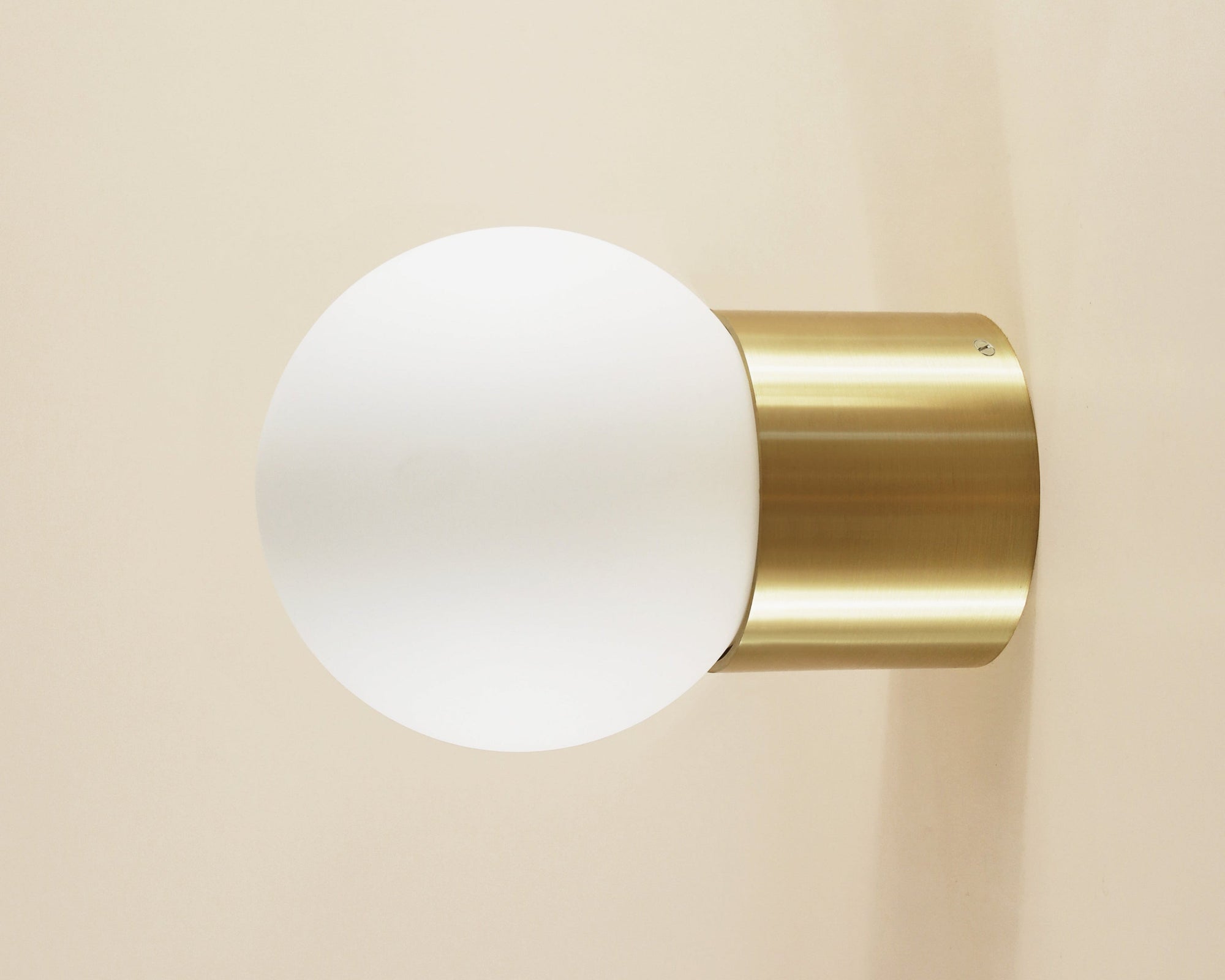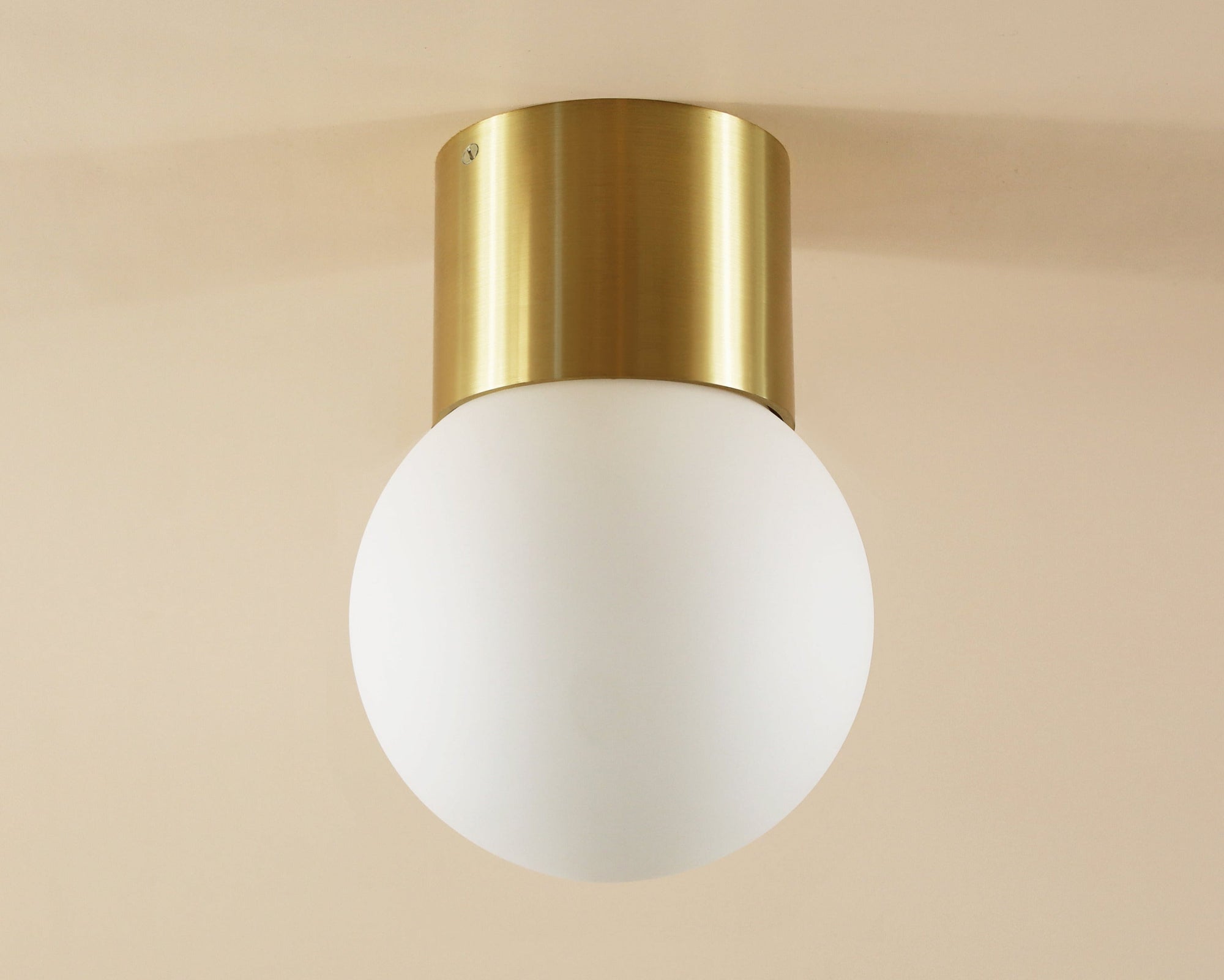 Designed and handmade to order in our Texas studio. Features heavy gauge solid brass construction with hand blown opal matte 6" globe. Wall mounted for vanity or accent lighting. Ceiling mounted for general purpose lighting.