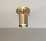 Designed and handmade to order in our Texas studio. Features heavy gauge solid brass construction. Shade head adjust up and down and turns 330 degrees on axis. Excellent directional ceiling downlight for flat or vaulted ceilings, this fixture is a great alternative to recessed can lights and perfect for providing general or task lighting throughout any home or business.