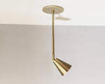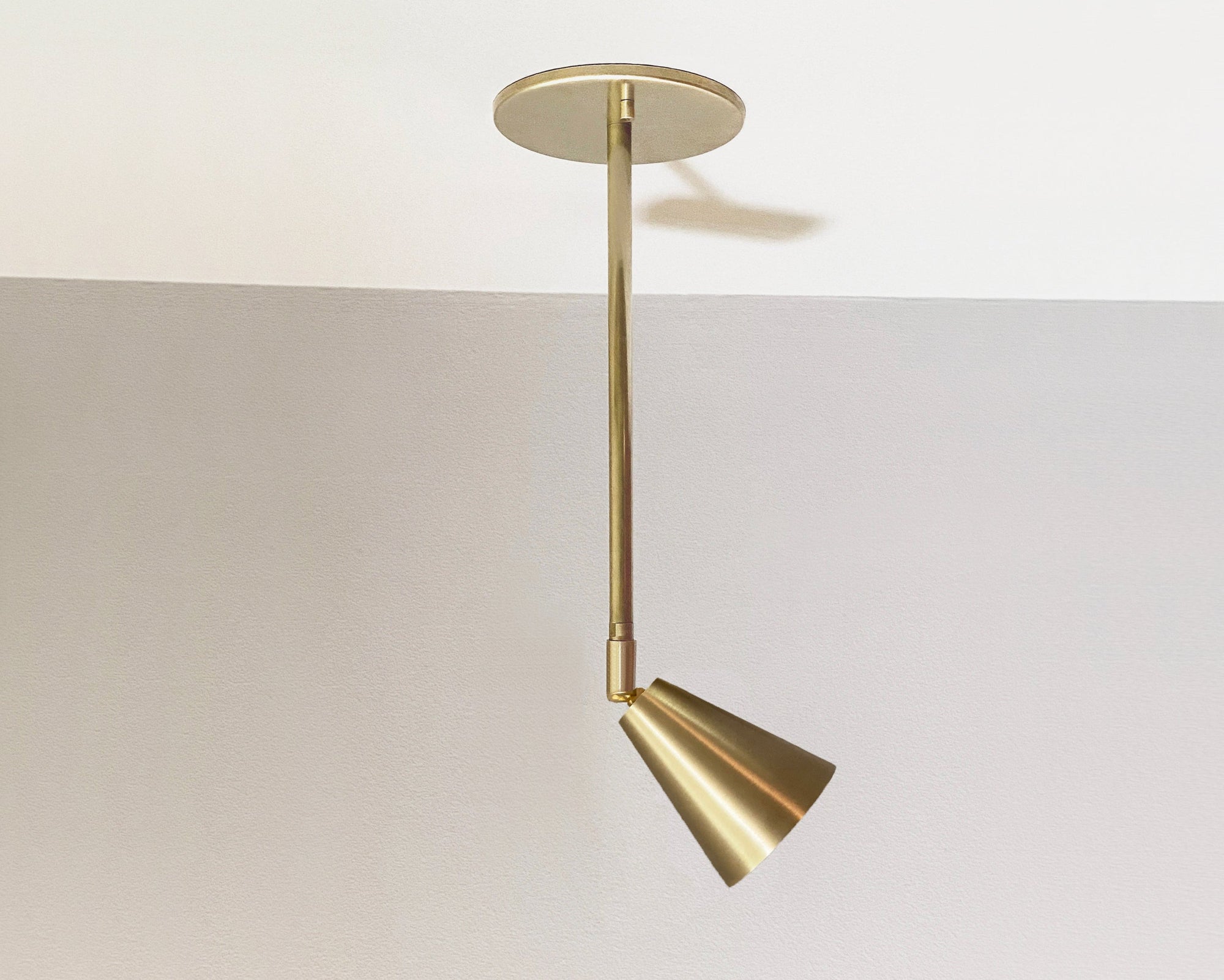 Designed and handmade to order in our Texas studio. Features heavy gauge solid brass construction. Shade head adjust to true vertical and horizontal positions and turns 330 degrees on axis. Excellent directional ceiling downlight for flat or vaulted ceilings, this fixture is a great alternative to recessed can lights and perfect for providing general or task lighting throughout any home or business.